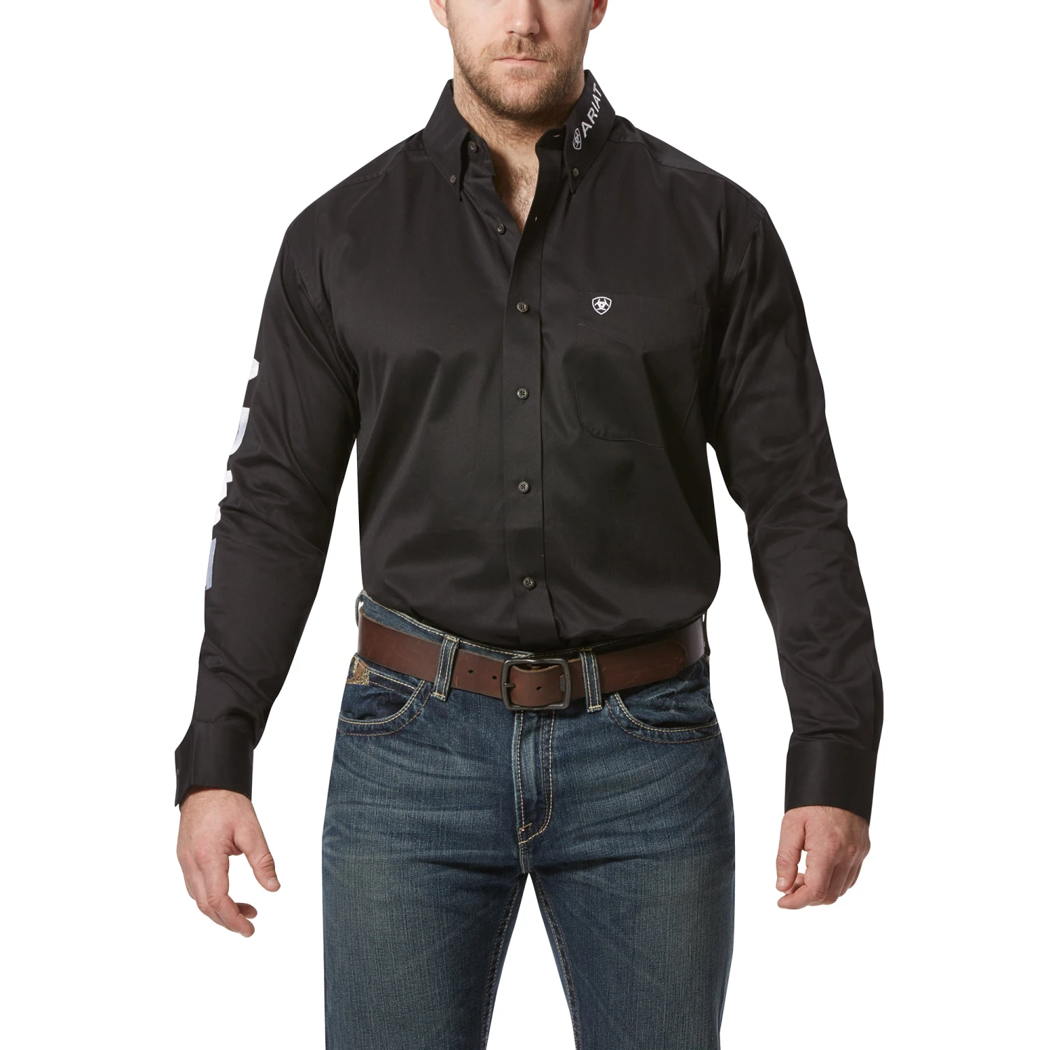 Black with White Team Logo Long Sleeve Button Down Shirt.