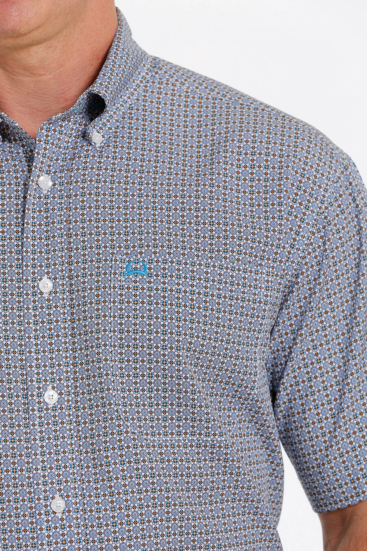 White and Blue Geometric Print Short Sleeve ArenaFlex Button Down Shirt.