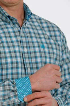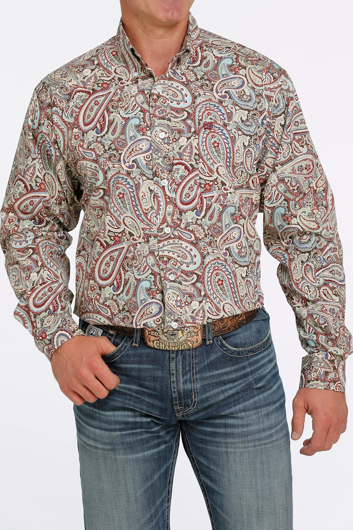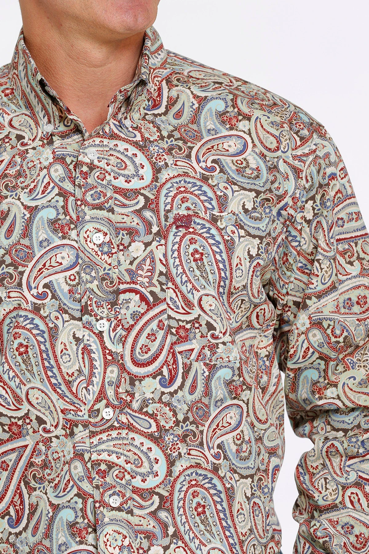 Burgundy, Aqua and Brown Paisley Long Sleeve Button Down Shirt.