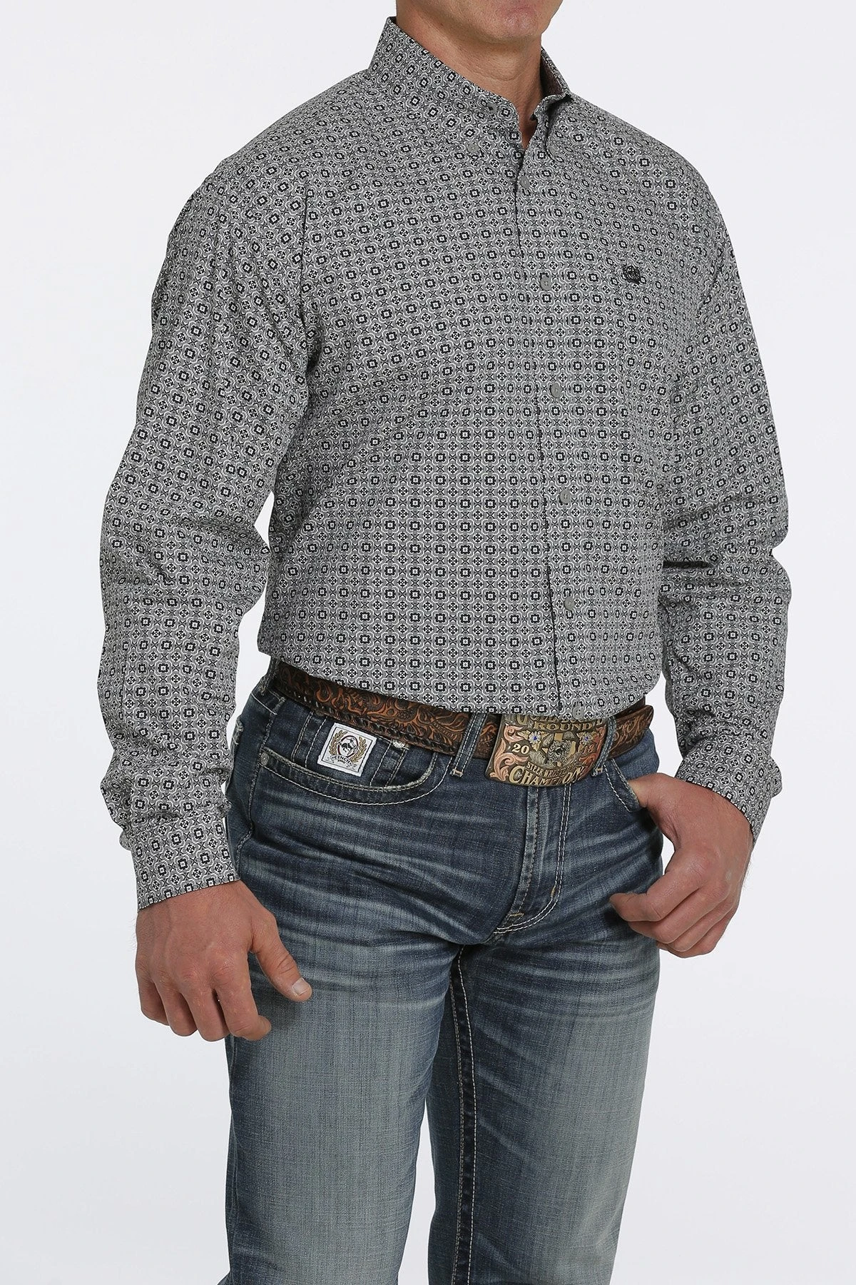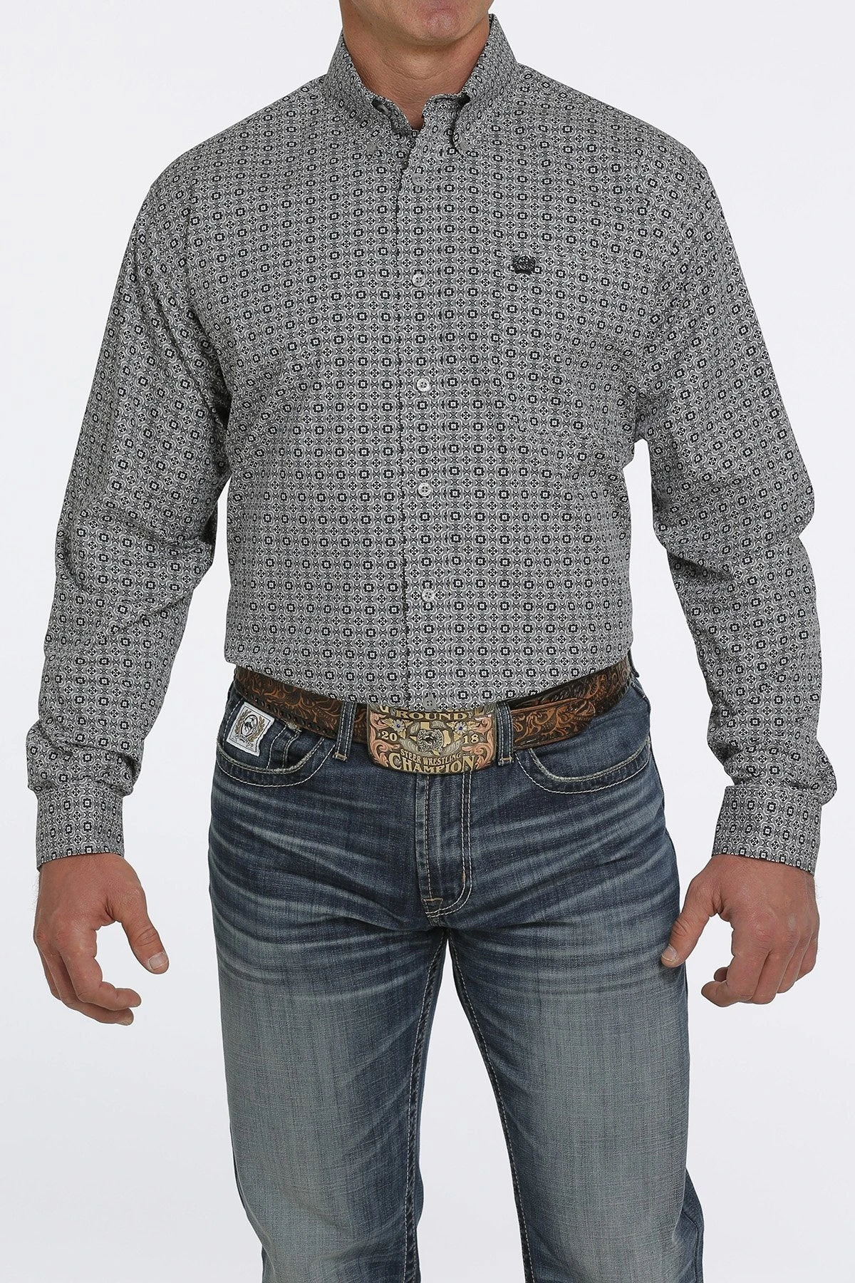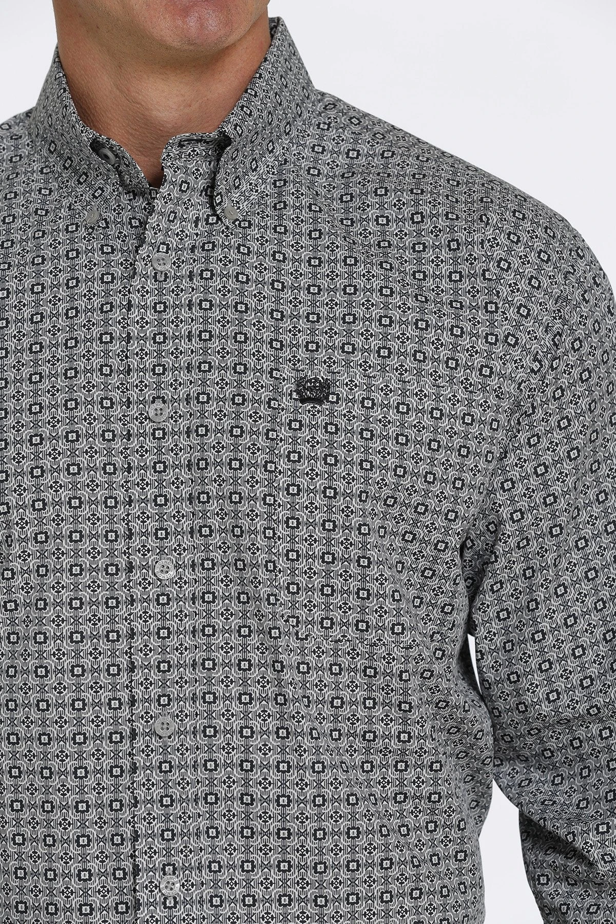 Gray and Navy Medallion Print Long Sleeve Button Down Shirt.