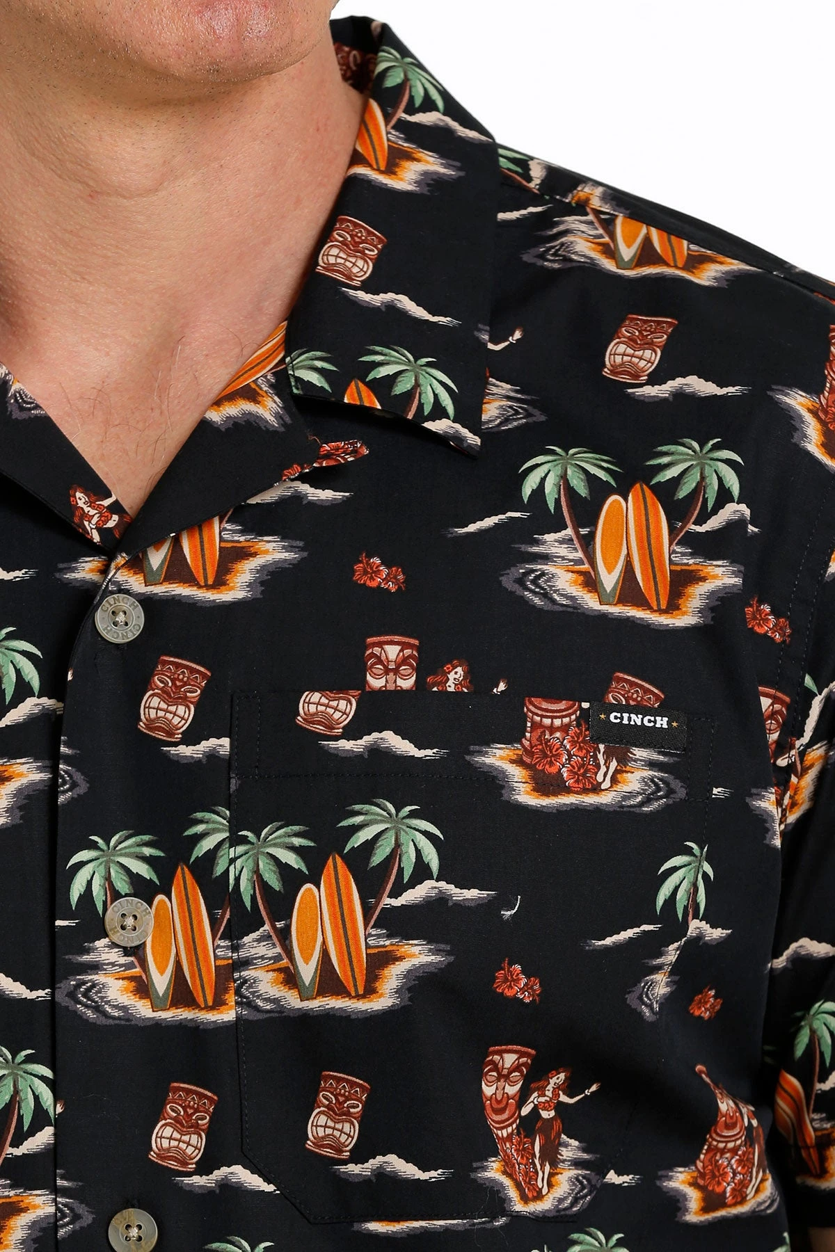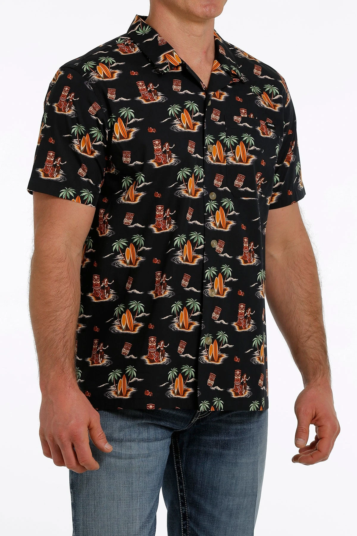 Black with All Over Tiki Print Short Sleeve Button Down Shirt.