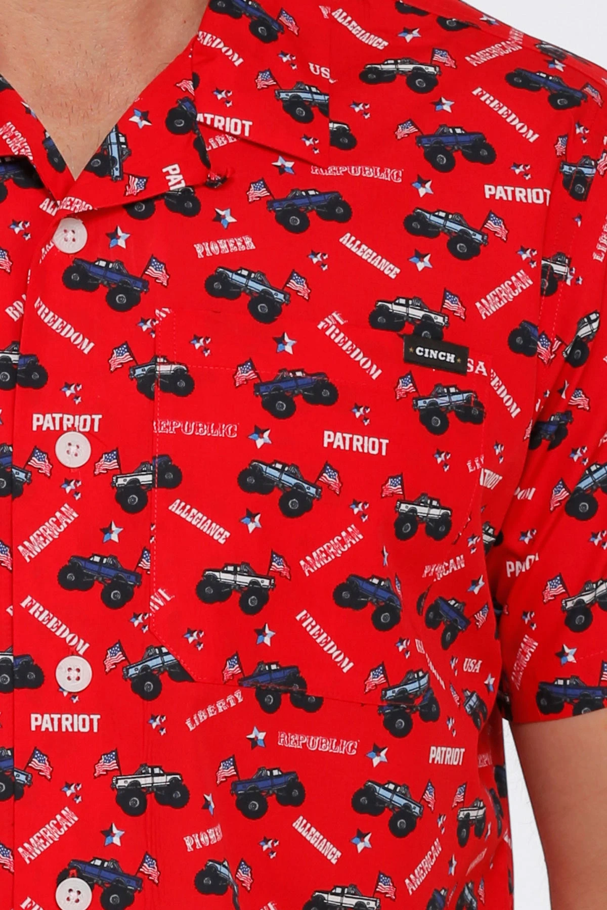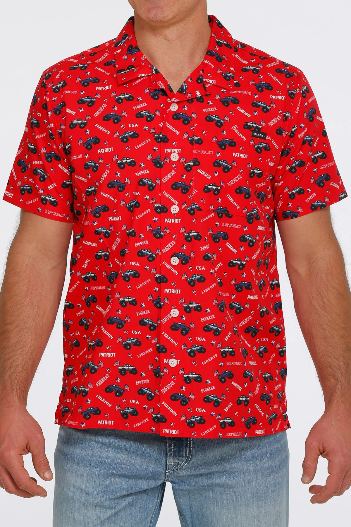 Red Patriot Truck Print Short Sleeve Button Down Shirt.