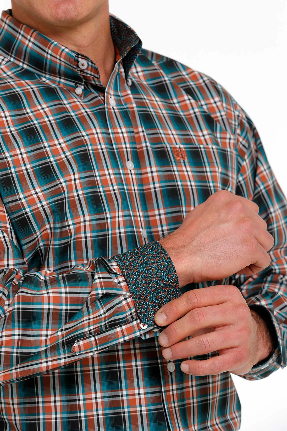 Cinch Men’s Orange/Blue/Black Plaid Button Down Long Sleeve Shirt