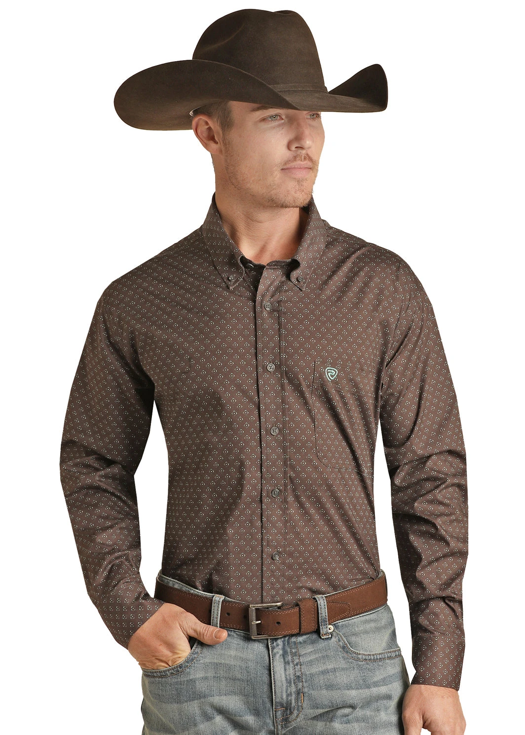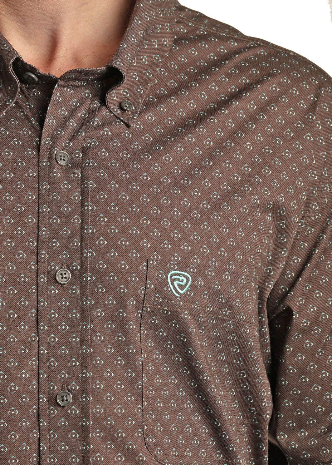 Brown and Aqua Geometric Print Long Sleeve Button Down Shirt.