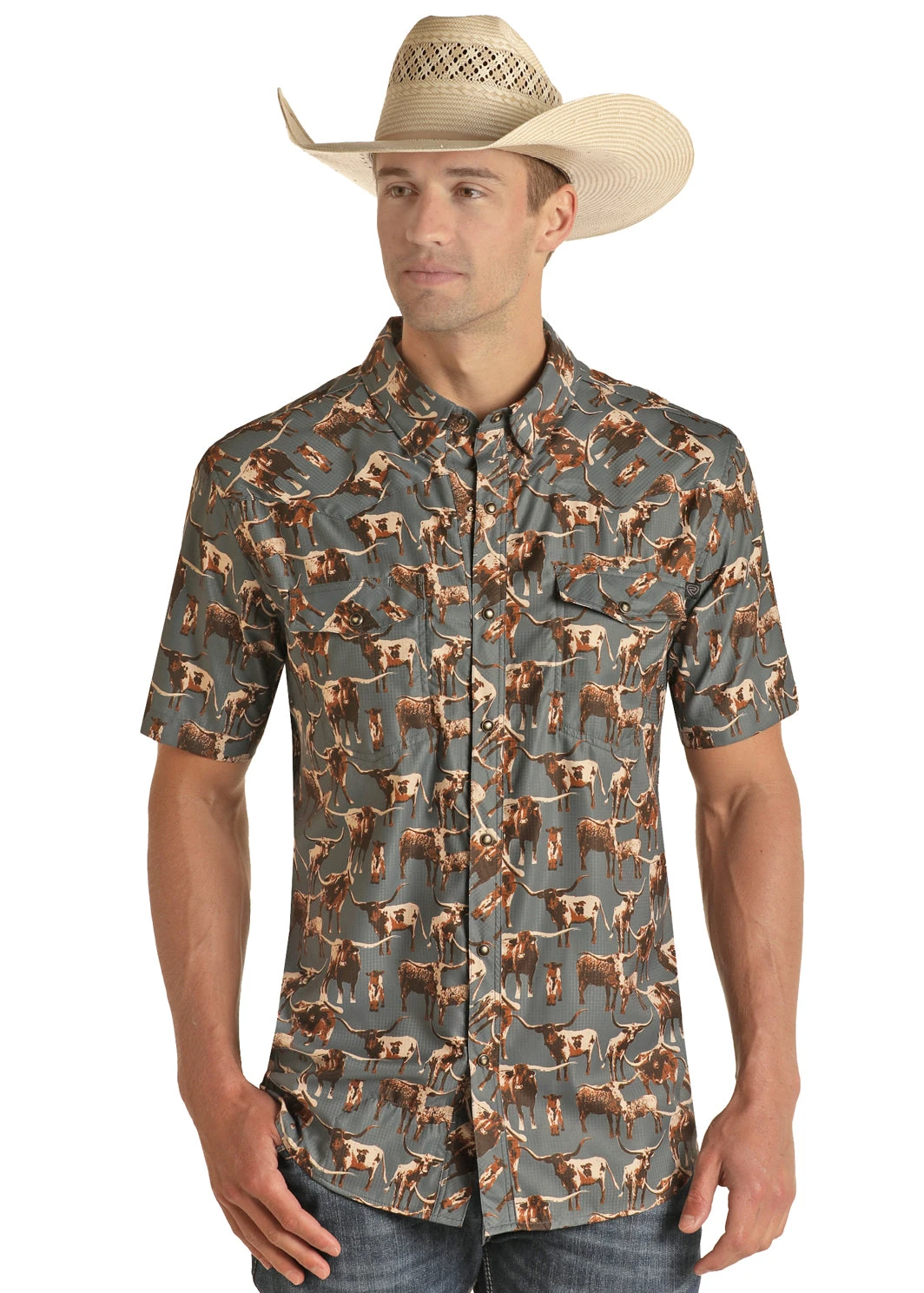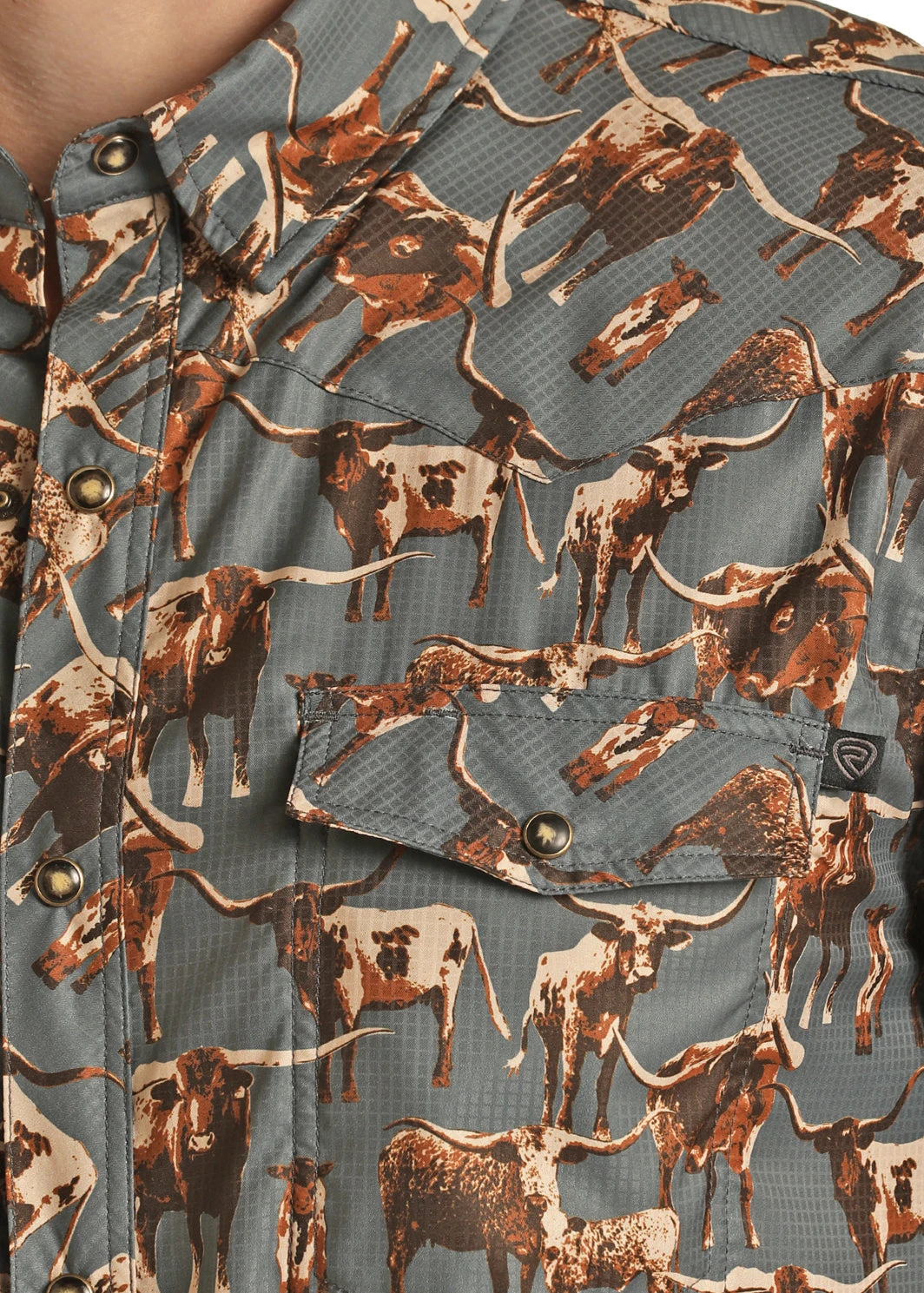 Slate Grey with Longhorn Print Short Sleeve Ripstop Snap Front Shirt.