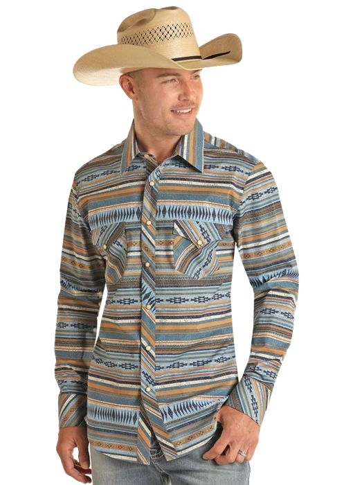 Blue Aztec Stripe Long Sleeve Snap Front Shirt.