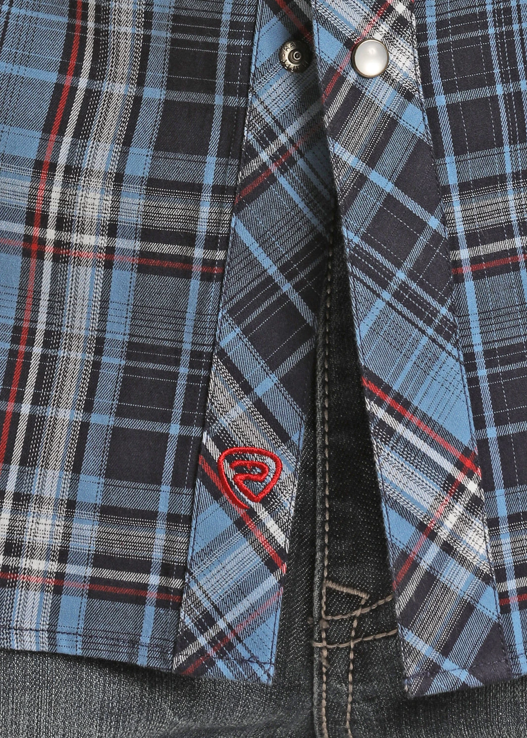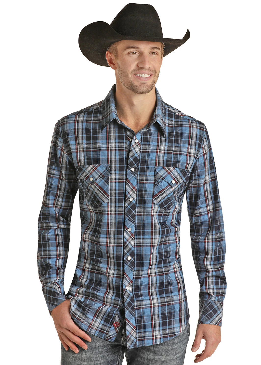 Blue Plaid Long Sleeve Snap Front Shirt.