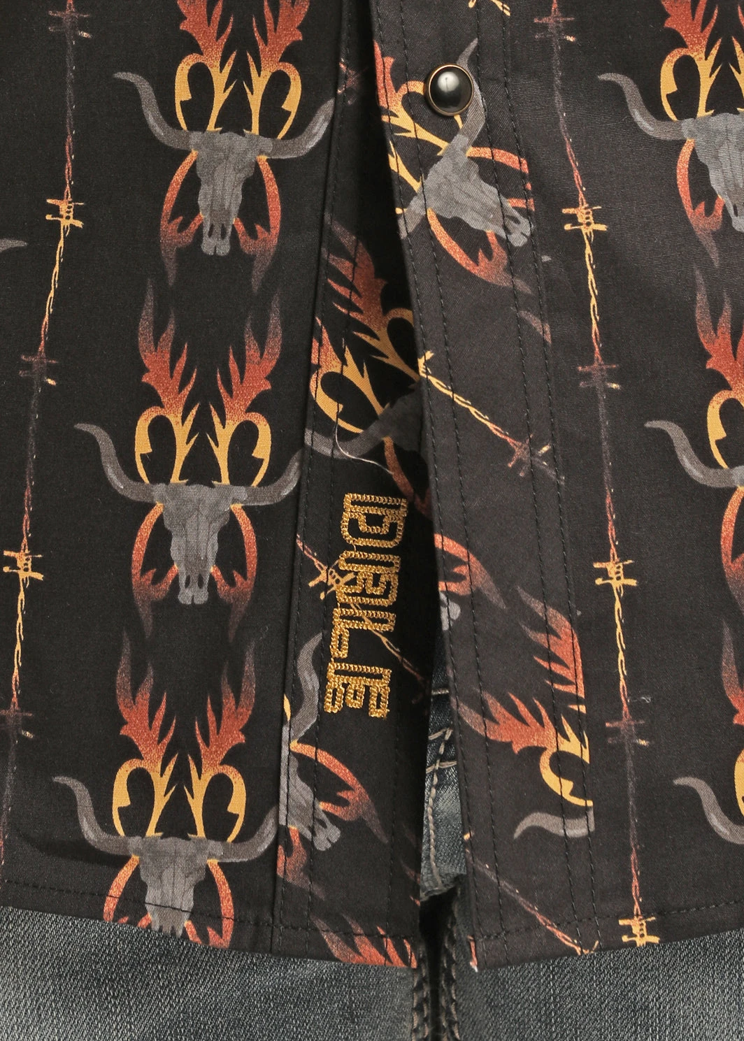 Black with Fire and Steer Head Print Long Sleeve Snap Front Shirt.