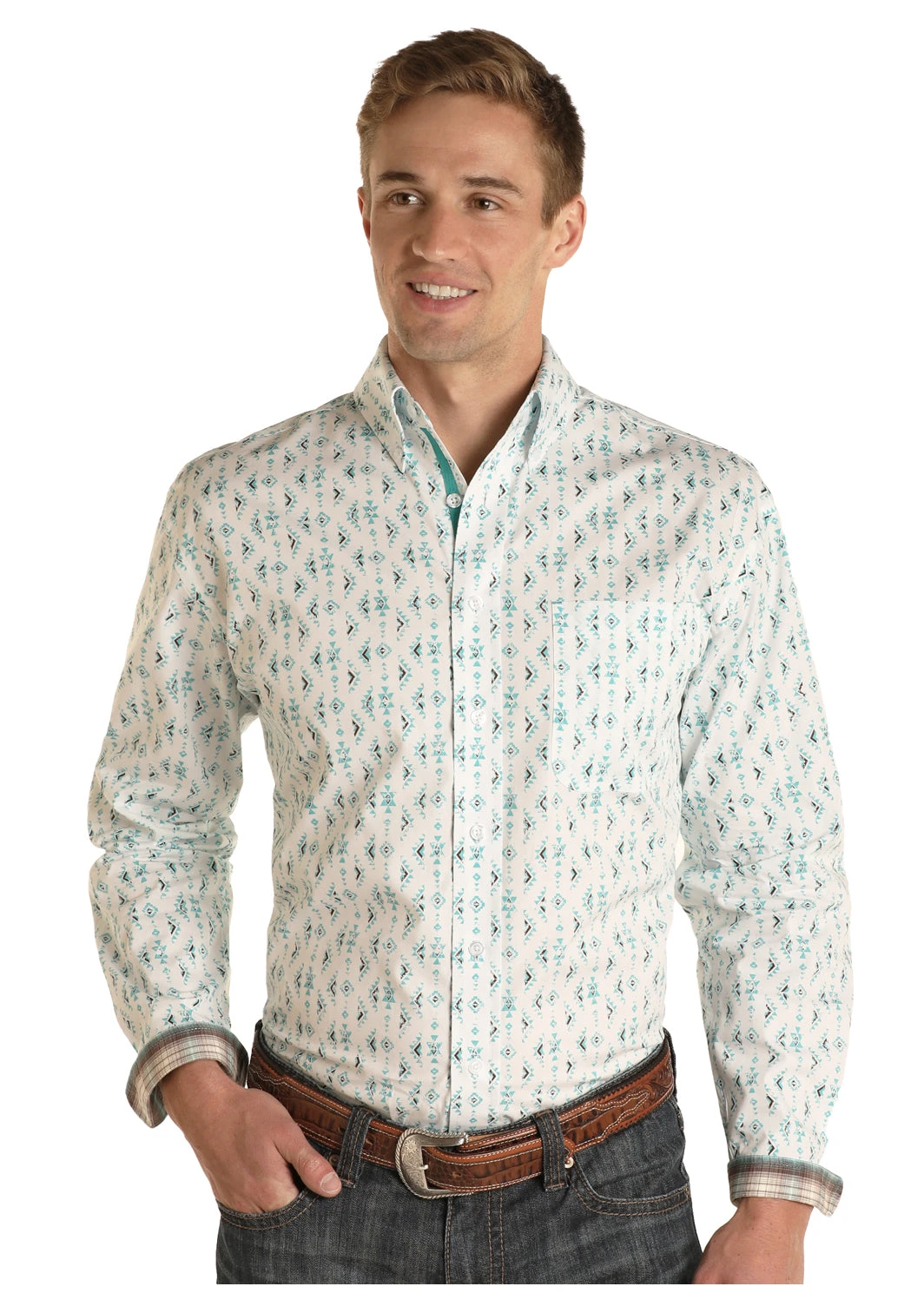 White with Blue and Black Aztec Print Long Sleeve Button Down Shirt.