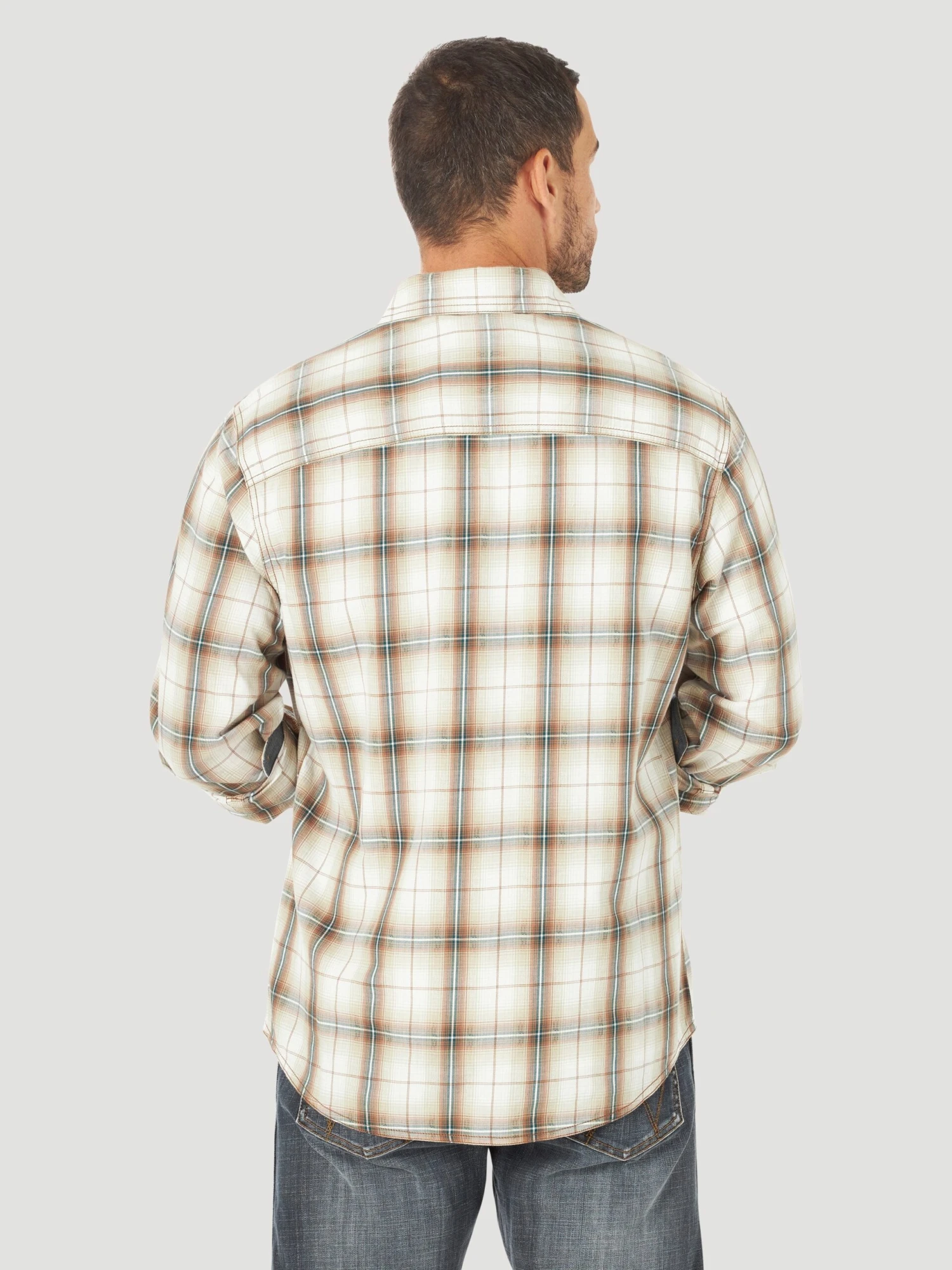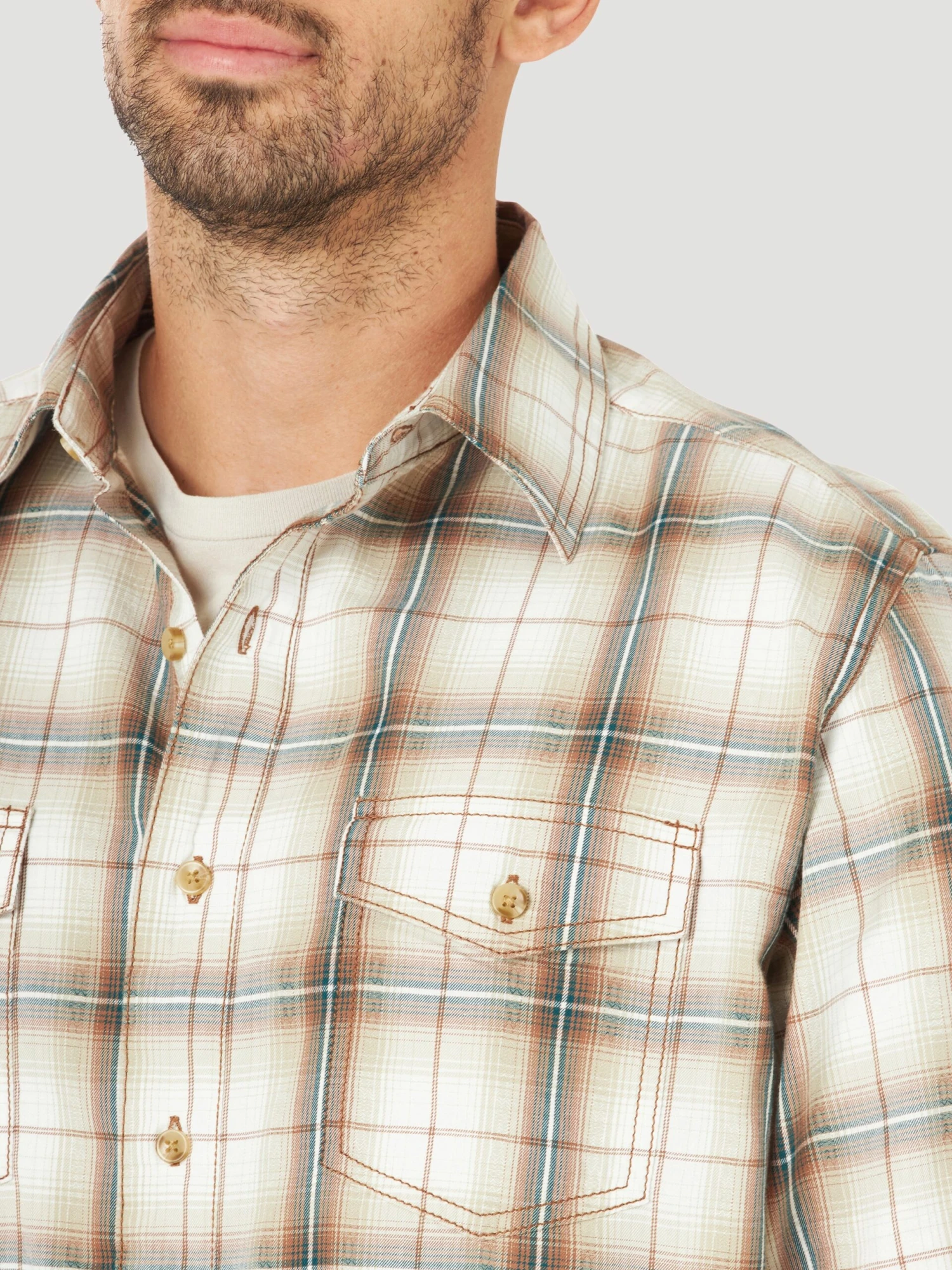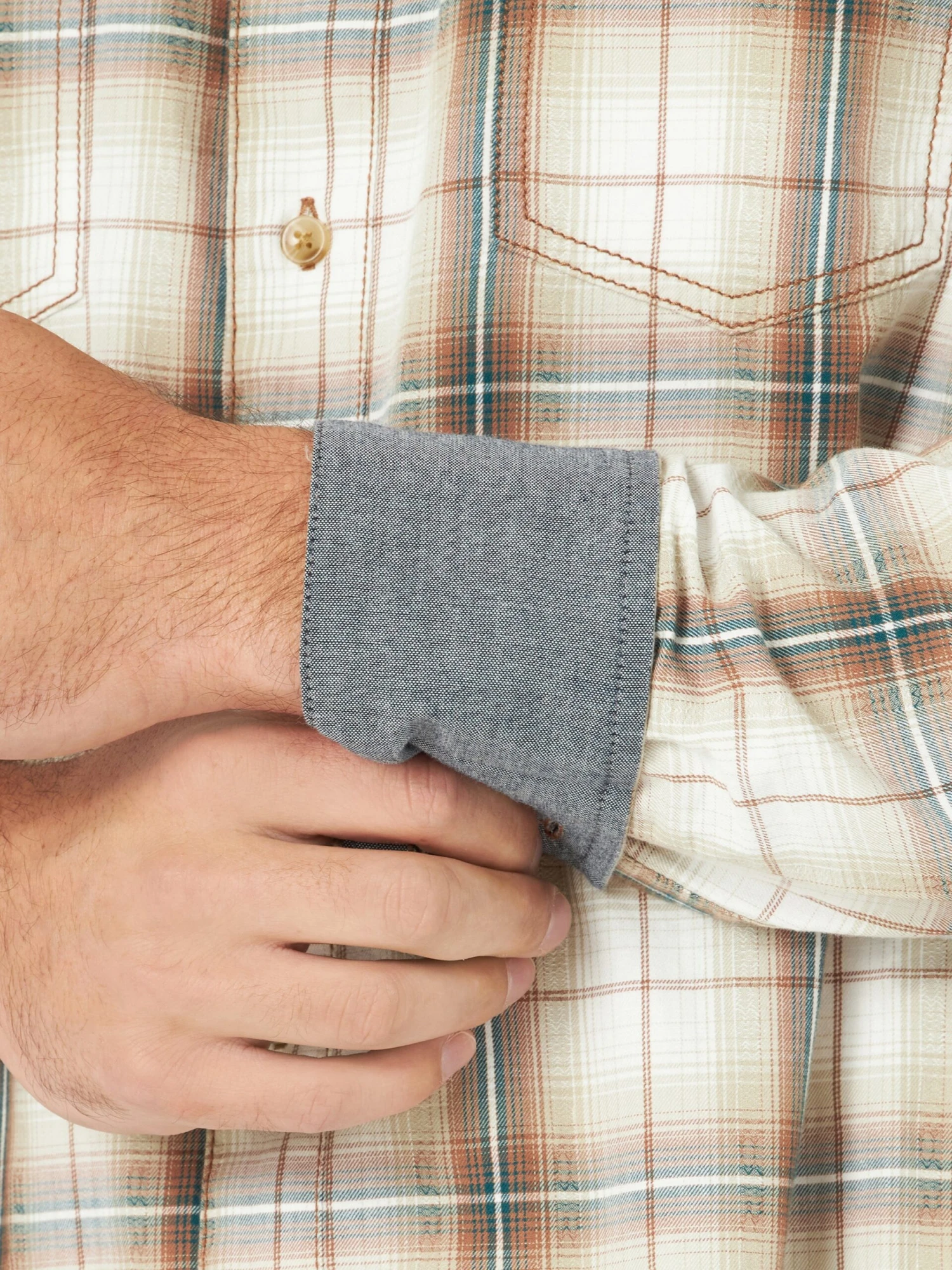 Cream, Brown and Blue Plaid Long Sleeve Button Down Shirt.