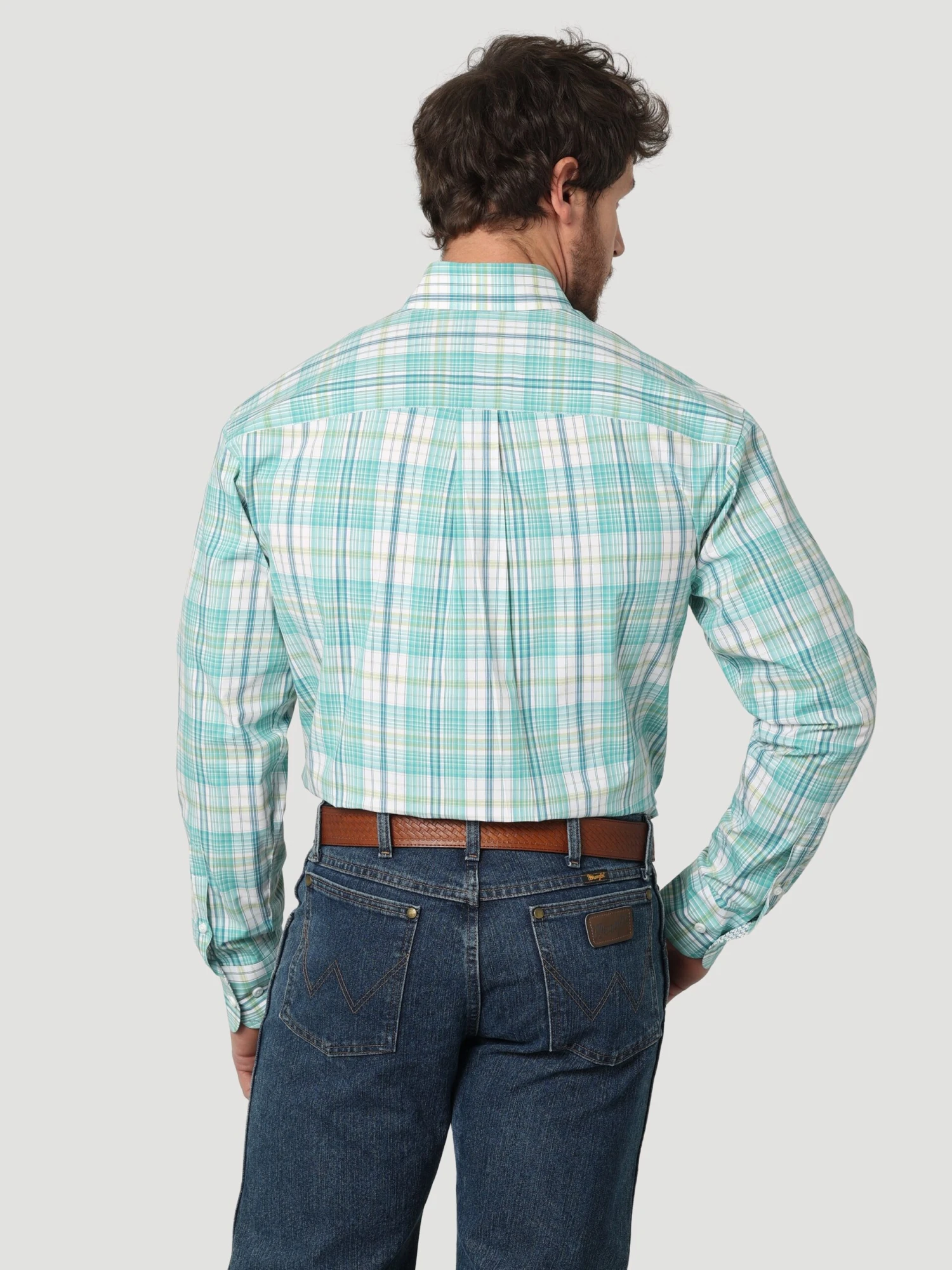 Turquoise Madras Plaid Long Sleeve Button Down Shirt.