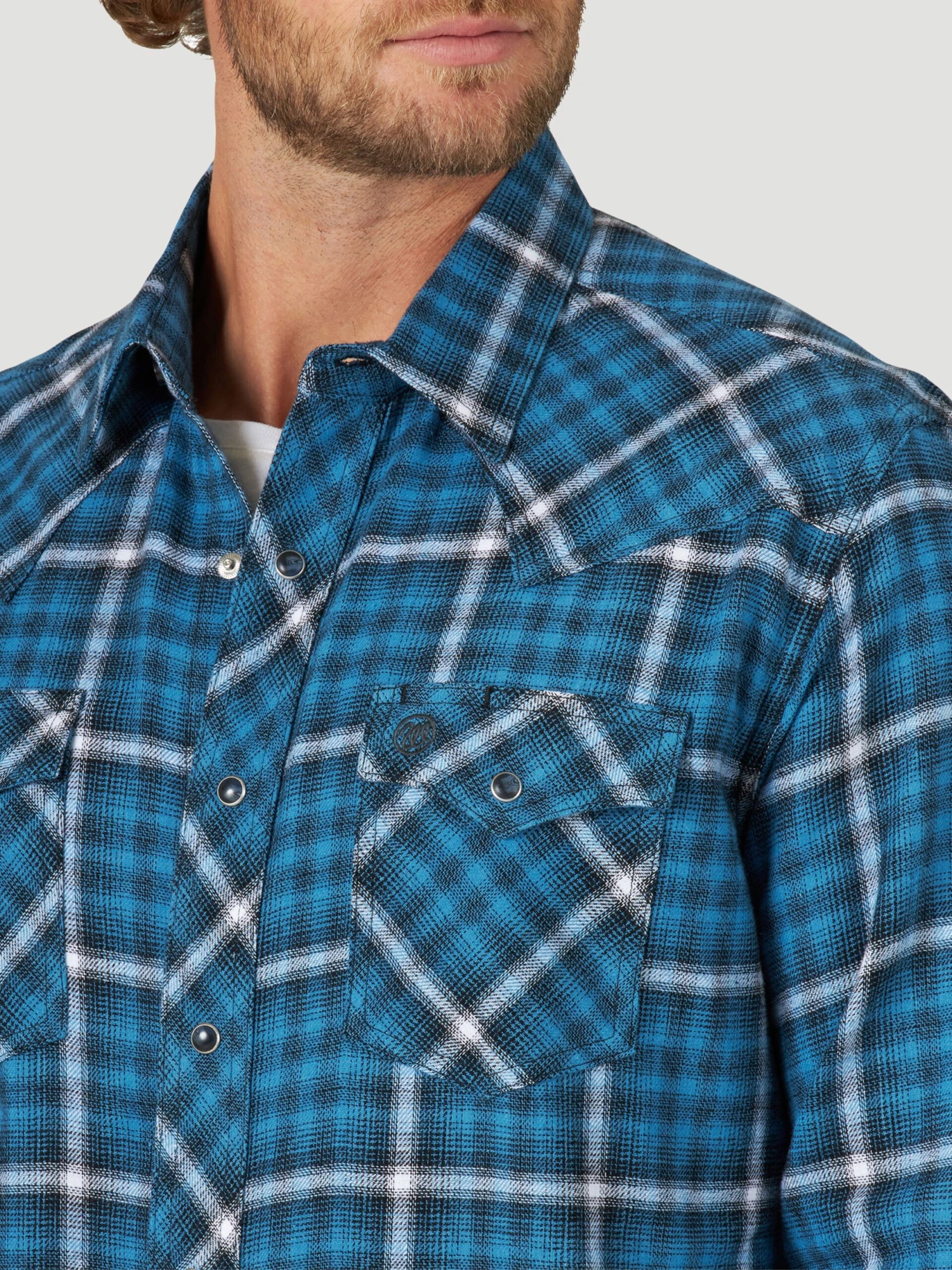 Blue Cat Plaid Flannel Long Sleeve Snap Front Shirt.