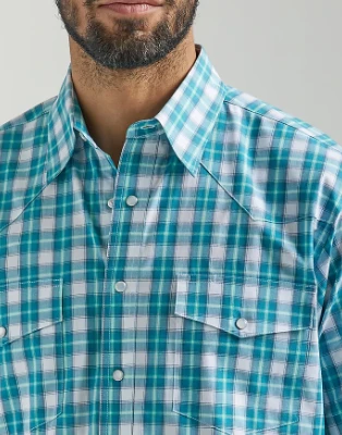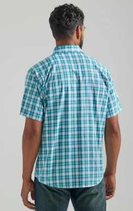 Teal Plaid Short Sleeve Wrinkle Resist Snap Front Shirt.
